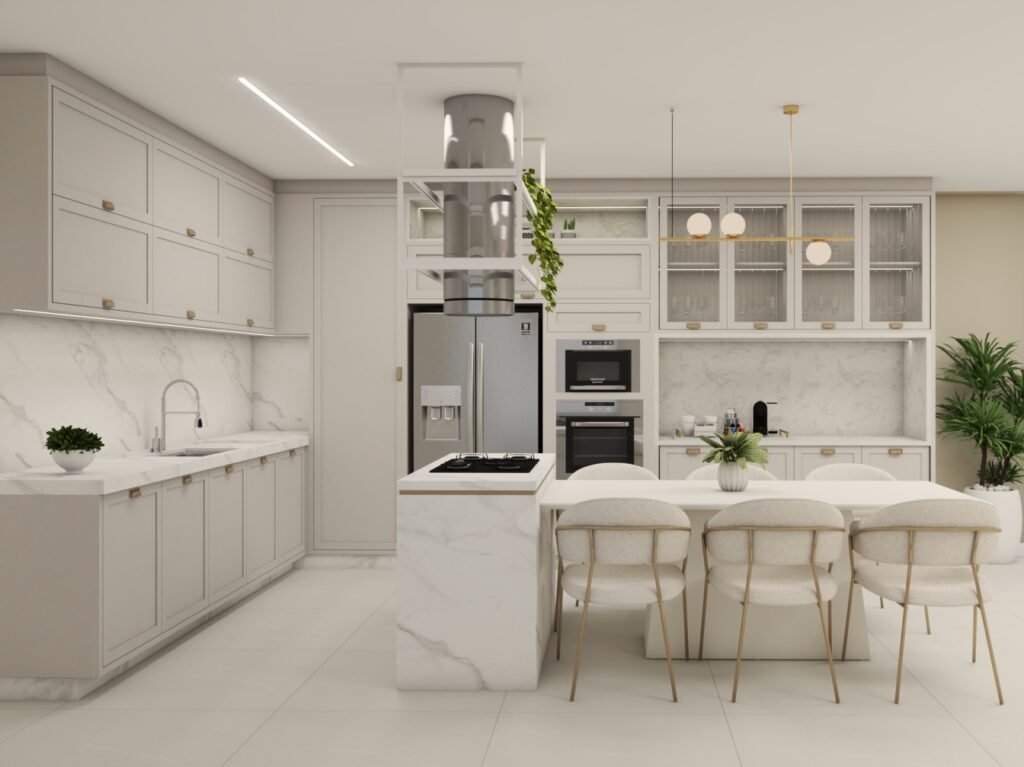 Contemporâneo minimalista com paleta de cores neutras transmitindo leveza, sofisticação e um design limpo e funcional.